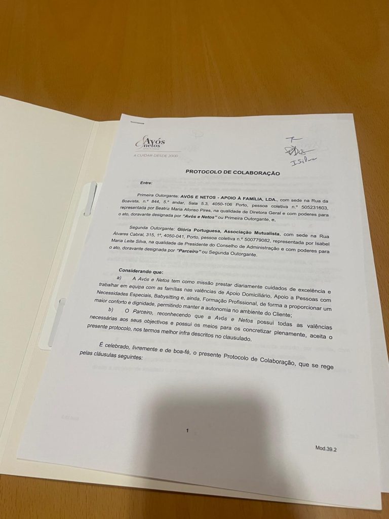 Em agosto a Gloria Portuguesa Associação Mutualista assinou um protocolo de colaboração com a empresa Avós e Netos – Apoio à Família, Lda.